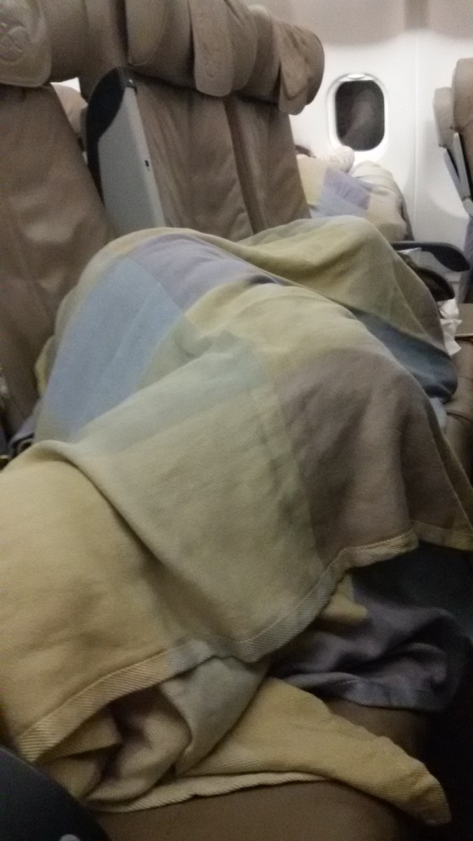 Llegamos hasta una cafetería, pedimos algo para tomar -ya que no teníamos hambre- y nos sentamos a esperar en un contexto algo más ruidoso del que estábamos, viendo pasajeros bengalíes, hindúes y árabes apretujados en las salas de espera mientras era nuestro turno para embarcar. Finalmente, se dio orden de abordaje y pudimos entrar al avión que nos llevaba con destino a Madrid. Oh Fortuna! Estaba casi vacío, hasta el punto de que cada uno pudo tomar una fila de asientos de la parte central de avión, retirar los reposa brazos y hacer una cama que, para nosotros, se sintió igual o más cómoda que la de primera clase cuando el avión hubo alcanzado altura de crucero. Aunque no dormí, creo que descansé bastante de estar sentada toda la noche.