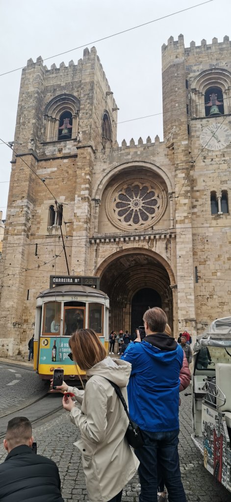 Aquí está, ya en su lugar junto con las demás obras del maestro, creando la vía para el icónico Tranvía N°28 de Lisboa, como se puede ver aquí, pasando justo ante la Catedral (Sé) de Lisboa:
